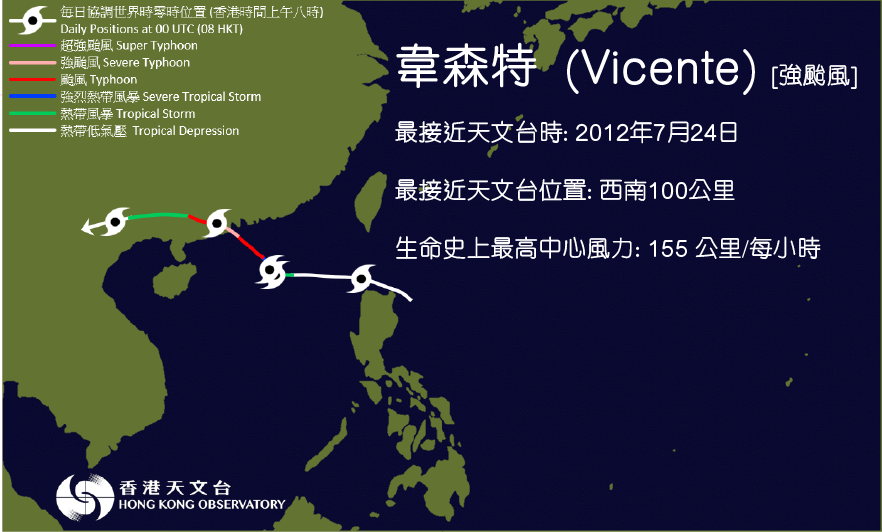 2012年7月,颱風韋森特吹襲香港,帶來強風和暴雨,導致138人受傷,多處建築物和樹木受損。這場颱風是自1999年以來首次掛起「十號風球」,提醒了香港市民颱風的潛在威脅,促使政府進一步完善防災預警系統。