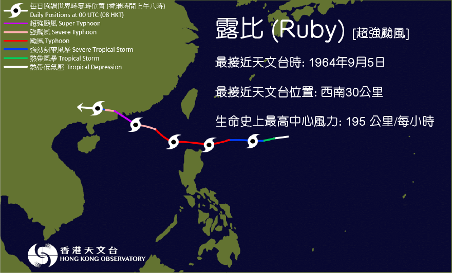 1964年9月,颱風露比襲擊香港,帶來強風、暴雨和風暴潮,造成超過700人死亡、數千人受傷,房屋和船隻嚴重受損,沿海地區大範圍淹水。這場颱風是香港歷史上最致命的風災之一。