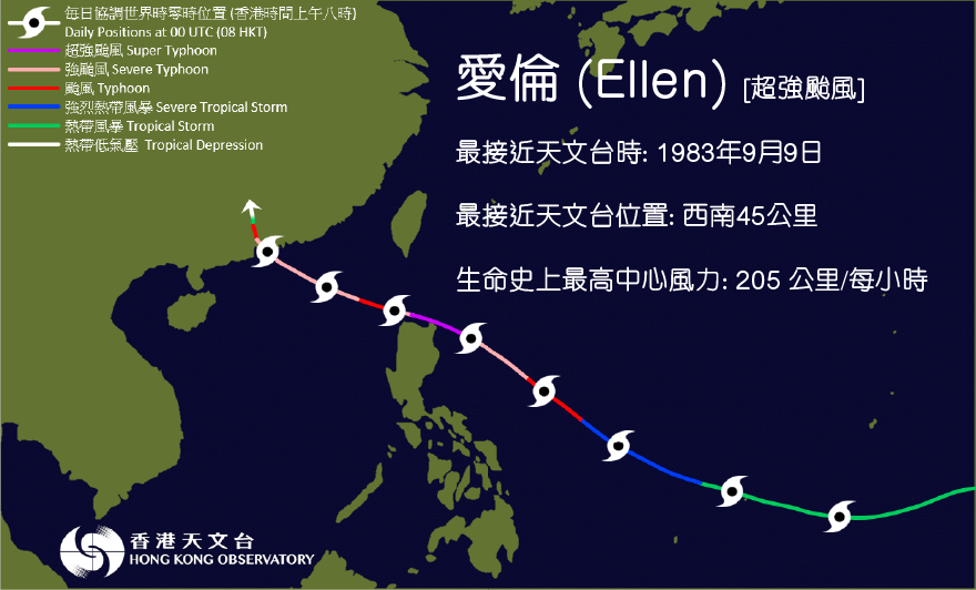 1983年9月,颱風愛倫襲擊香港,風力強勁並伴隨暴雨,導致10人喪生、數十人受傷,多處建築物和樹木倒塌。這場颱風引發了山泥傾瀉和局部水浸。